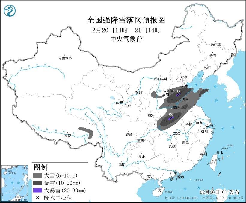 中新網(wǎng)2月20日電 據(jù)中央氣象臺網(wǎng)站消息,預(yù)計2月20日14時至2月21日14時,陜西北部、山西東南部、河北南部、山東、河南、安徽北部、湖北西部、西藏東部等地部分地區(qū)有大到暴雪,其中,河北南部、河南南部等地局地有大暴雪(20~22毫米)。上述部分地區(qū)新增積雪深度3~8厘米,局地可達(dá)12厘米以上。
