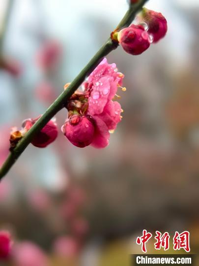 晶瑩的水滴為燦爛的梅花中增加了點點浪漫。(中新網(wǎng)記者陳靜攝)