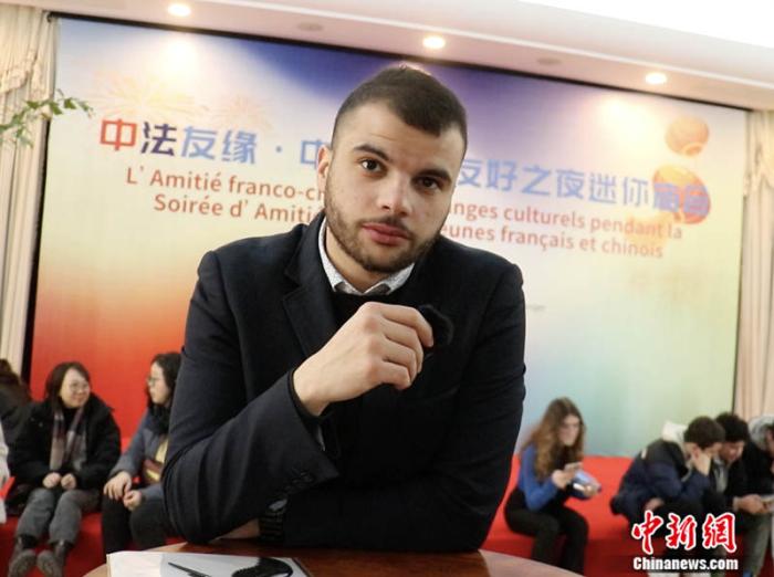 法國人民援助會全國委員會委員、本次青年代表團(tuán)團(tuán)長朱利安·維蘭(Julien Villain)接受中新網(wǎng)記者采訪。中新網(wǎng)黃方 攝