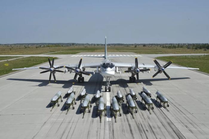 俄一架圖-95MS轟炸機(jī)前擺放著14枚導(dǎo)彈。圖片來源:俄羅斯國(guó)防部