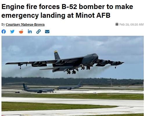 據(jù)報(bào)道,當(dāng)天,美國邁諾特空軍基地發(fā)言人稱,當(dāng)?shù)貢r(shí)間23日,一架B-52H型戰(zhàn)略轟炸機(jī)從該基地起飛,一臺發(fā)動機(jī)在空中起火,隨后被迫緊急降落該基地。報(bào)道稱,飛機(jī)著陸后,火被撲滅,機(jī)組人員沒有傷亡。