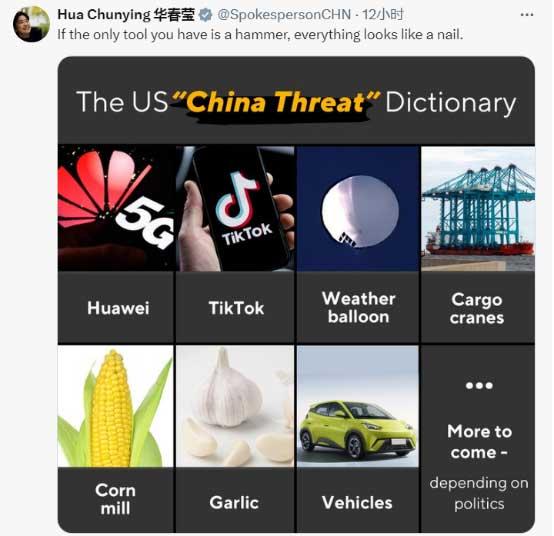 華春瑩最后回?fù)?,“如果你唯一的工具是錘子,那么所有東西看起來(lái)都像釘子。”這條帖文隨附圖片上,列出美國(guó)以往炒作“中國(guó)威脅”的詞典:包括華為,TikTok,氣象無(wú)人飛艇,起重機(jī),玉米加工廠,大蒜,汽車……還有更多,取決于政治因素?!?/p>