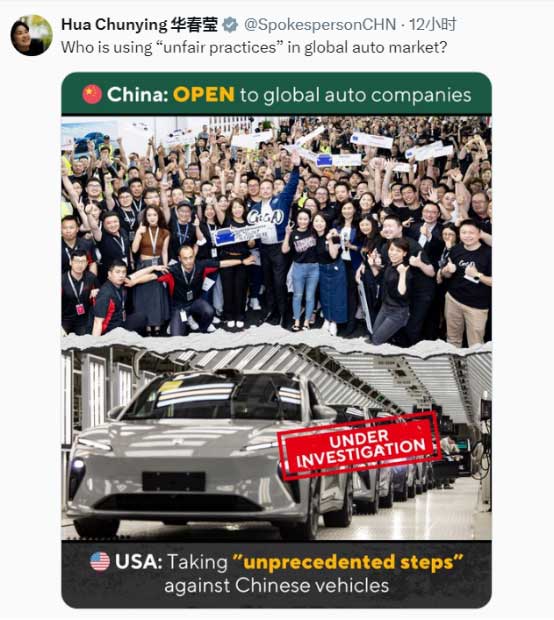 她隨后發(fā)表圖文,對(duì)比中美在汽車行業(yè)的行為問(wèn)道,“是誰(shuí)在全球汽車市場(chǎng)采取‘不公平做法’?”圖片顯示,中國(guó)的做法是“向全球車企”開(kāi)放,而美國(guó)正針對(duì)中國(guó)汽車采取“前所未有的措施”?!?/p>