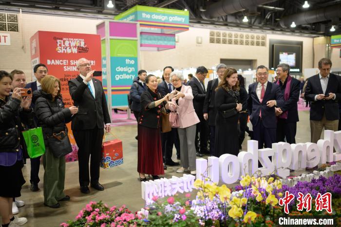 當(dāng)?shù)貢r(shí)間3月2日,一年一度的費(fèi)城花展在美國賓夕法尼亞州費(fèi)城開幕,以“功夫鄭州——花俏嵩山”為主題的鄭州展園當(dāng)天在花展上亮相。圖為中國駐紐約總領(lǐng)事黃屏(右三)帶領(lǐng)嘉賓參觀鄭州展園?!ranck Zhou 攝