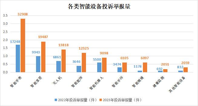 隨著物聯(lián)網(wǎng)、人工智能、5G通信等技術(shù)的突破,智能設(shè)備不斷更新迭代。各類可穿戴智能設(shè)備、智能家居越來越受到消費(fèi)者的青睞,相關(guān)消費(fèi)糾紛增長較快。2023年,全國12315平臺共接收智能設(shè)備投訴舉報(bào)10.4萬件,同比增長1.1倍。其中智能手表(3.3萬件)、智能家居(1.9萬件)投訴舉報(bào)較多;智能眼鏡、智能配飾類別增長較快,分別同比增長4.2倍、2.4倍。消費(fèi)者反映問題主要集中在售后服務(wù)困難、泄露消費(fèi)者個(gè)人信息、產(chǎn)品實(shí)際功能與宣傳不符等。