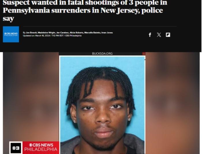 據(jù)報道,這名26歲的嫌疑人在兩處不同的住宅中殺害了3人,隨后劫持了一名司機前往新澤西州,最終在新澤西州一處住宅附近被逮捕。報道稱,這起槍擊事件的受害人包括嫌疑人的繼母和他13歲的妹妹。