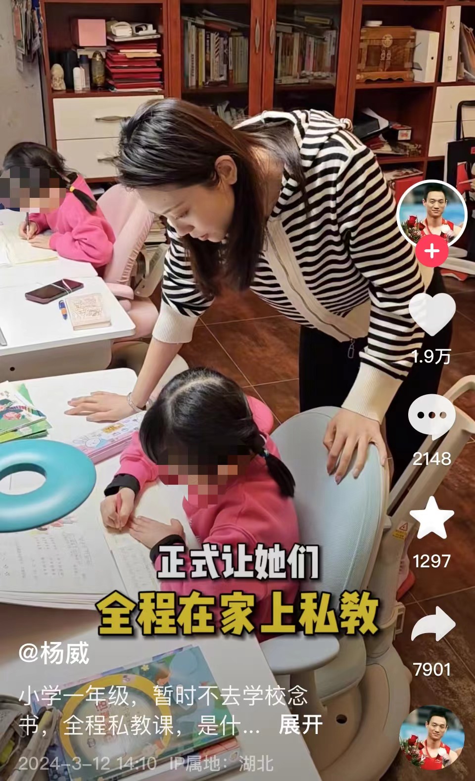 近日,體操奧運(yùn)冠軍楊威在社交平臺發(fā)布視頻稱,由于去年兩個女兒連生好幾場病后,他跟妻子楊云做了個大膽嘗試,讓上一年級的兩個女兒暫時不去學(xué)校念書,全程在家上私教。