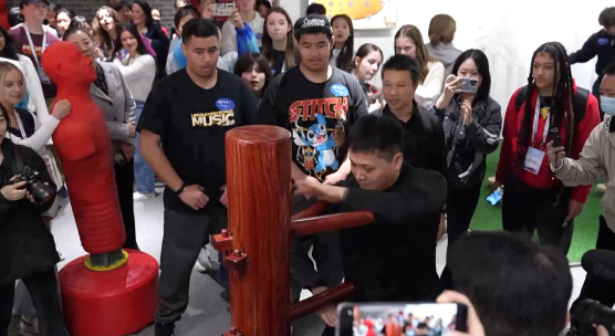 詠春拳木人樁、梅花樁、長(zhǎng)矛等武術(shù)表演,引來代表團(tuán)中的學(xué)生們踴躍體驗(yàn)。