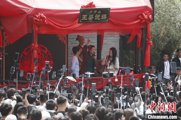在“王婆說媒”現(xiàn)場,中新網記者看到人山人海的游客以年輕人居多,“王婆”扮演者趙梅因口才、表演力、控場等功底詼諧幽默,深受到年輕人追捧,她不時插科打諢、即興歌舞,引得現(xiàn)場陣陣歡呼。