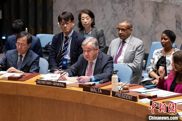 當(dāng)?shù)貢r間4月14日,聯(lián)合國安理會就伊朗襲擊以色列在紐約聯(lián)合國總部召開緊急會議。圖為聯(lián)合國秘書長古特雷斯發(fā)言。 中新社記者 廖攀 攝