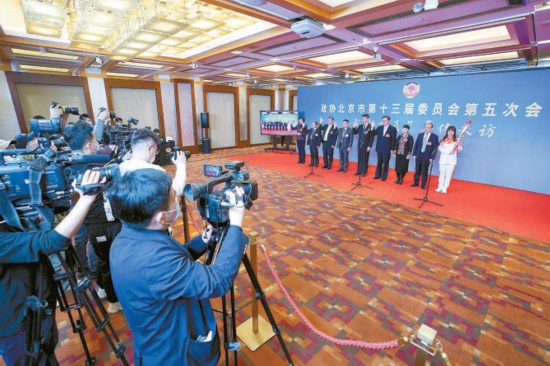 昨天,市政協(xié)十三屆五次會議舉辦“我是委員”集體采訪。8名委員在現(xiàn)場,1名委員通過視頻圍繞“冬奧有我”“科創(chuàng)中心建設”“履職為民”三個主題回答記者提問。 本報記者 方非攝