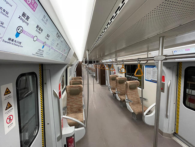 走進(jìn)車廂,記者注意到,車內(nèi)沒有用來隔絕駕駛室與客室的間壁門,而是采用開放式駕駛室,乘客可在保證安全的情況下更直觀地感受駕駛員的視角。此外,考慮到接駁大興機(jī)場(chǎng)線大件行李旅客的需求,“虎鯨號(hào)”列車設(shè)計(jì)2節(jié)“特別”車廂,車廂內(nèi)設(shè)置左右兩邊單列單座的高鐵同款座椅,乘客可將大件行李放在座位側(cè)邊,避免車廂內(nèi)擁擠。