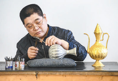“花絲鑲嵌工藝是一項(xiàng)融合藝術(shù),集掐絲、鏨刻、鑲嵌等工藝為一體?!瘪R福良介紹,河北大廠花絲鑲嵌制作技藝的歷史可上溯到漢代,隨著歷史的發(fā)展,融合了多民族、多地域的技藝特點(diǎn),形成了獨(dú)具特色的花絲工藝品。如今,大廠回族自治縣已成為我國北方地區(qū)花絲鑲嵌工藝品生產(chǎn)和出口基地。2008年,花絲鑲嵌制作技藝被列入國家級非物質(zhì)文化遺產(chǎn)名錄。2009年,馬福良成為這一項(xiàng)目的國家級代表性傳承人。