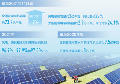 近年來,我國(guó)風(fēng)電、光伏等可再生能源裝機(jī)規(guī)模持續(xù)擴(kuò)大。截至2021年11月底,全國(guó)發(fā)電裝機(jī)容量約23.2億千瓦,同比增長(zhǎng)9%。其中,風(fēng)電裝機(jī)容量約3億千瓦,同比增長(zhǎng)29%;太陽能發(fā)電裝機(jī)容量約2.9億千瓦,同比增長(zhǎng)24.1%。