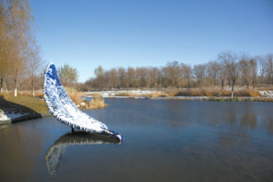 在通州區(qū)城市綠心森林公園的水系中,也有一件為冬奧會(huì)新創(chuàng)作的公共藝術(shù)作品《舟》。它看起來(lái)如同一葉代表“同舟共濟(jì)”的輕舟,也像一根羽毛、一片象征著和平與友誼的橄欖葉。走近仔細(xì)看,雕塑由許多鵝卵石般的陶瓷顆粒組成。它由中國(guó)藝術(shù)研究院雕塑家張冕、郅敏合作,是北京冬奧會(huì)公共藝術(shù)作品征集活動(dòng)評(píng)選出的最佳作品之一。