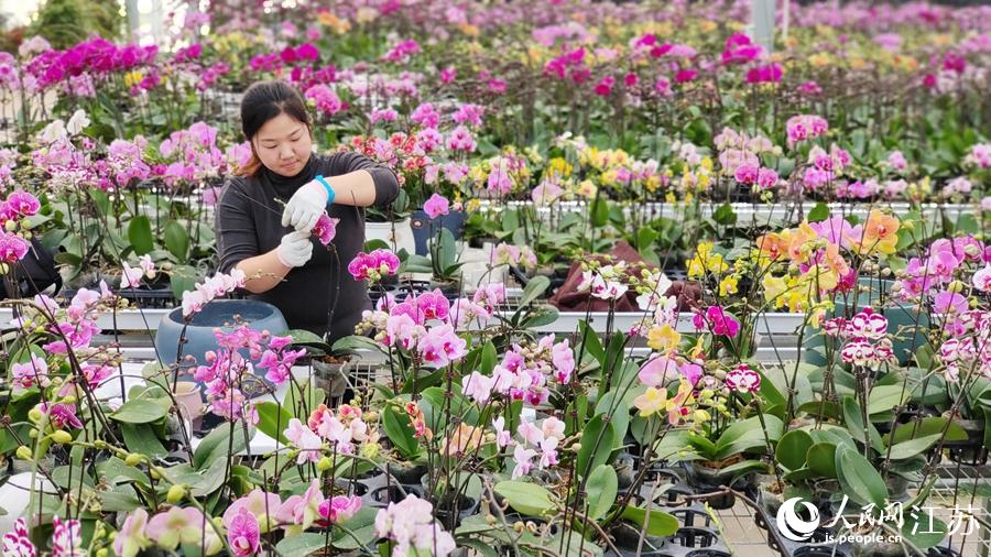 基地員工忙著對(duì)蝴蝶蘭進(jìn)行組盆。丁華明攝人民網(wǎng)宿遷1月13日電 (黃啟源)臨近春節(jié),江蘇沭陽縣耿圩鎮(zhèn)的蝴蝶蘭基地里百花爭(zhēng)妍,恰似彩蝶起舞。作為當(dāng)?shù)靥m花產(chǎn)業(yè)化示范園區(qū),這里培植有60余個(gè)蘭花品種,目前年實(shí)現(xiàn)產(chǎn)值過億元?;啬昀塾?jì)用工600余人,其中相當(dāng)一部分是當(dāng)?shù)氐褪杖霊?,可為每人每年增加工資性收入4萬余元。