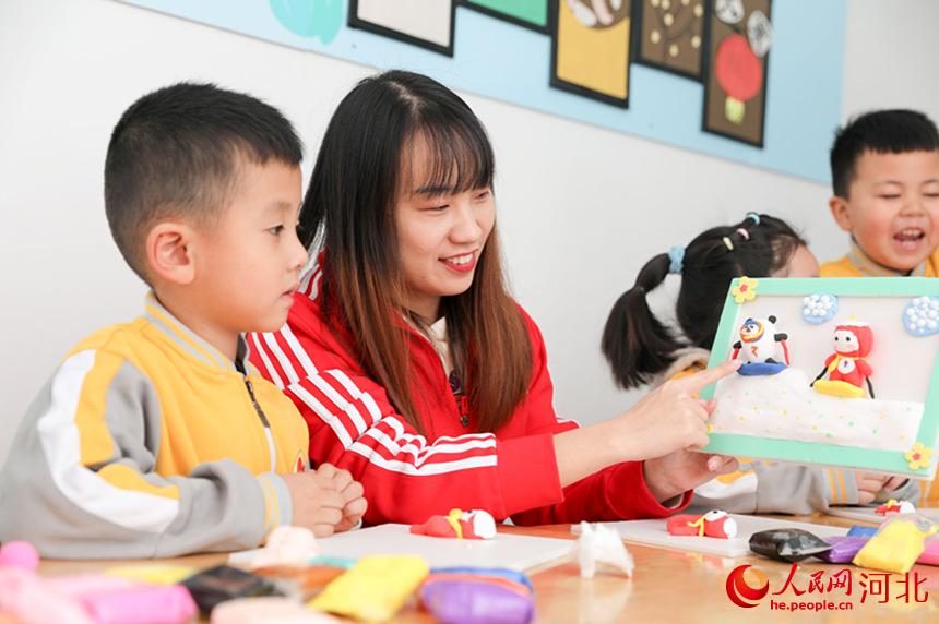 河北省邢臺市臨城縣縣直幼兒園孩子們在老師指導(dǎo)下,創(chuàng)作“迎冬奧”主題的手工作品。 劉一鳴攝