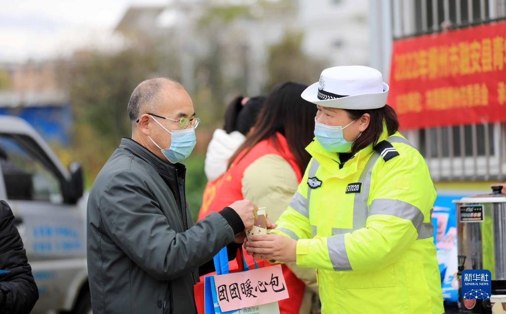 1月17日,在209國道廣西柳州市融安縣段“春運愛心驛站”,交通輔警為司乘人員送姜糖茶。新華社發(fā)(譚克興攝)