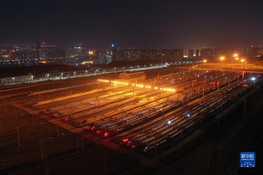 1月16日晚,動車組列車??吭谥袊F路蘭州局集團有限公司蘭州車輛段蘭州西動車運用所整備場上,為1月17日開始的2022年春運做好準備(無人機照片)。新華社記者 杜哲宇 攝