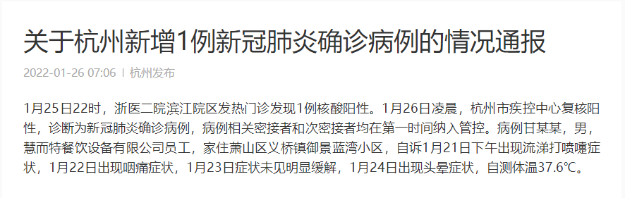 1月25日22時,浙醫(yī)二院濱江院區(qū)發(fā)熱門診發(fā)現(xiàn)1例核酸陽性。1月26日凌晨,杭州市疾控中心復(fù)核陽性,診斷為新冠肺炎確診病例,病例相關(guān)密接者和次密接者均在第一時間納入管控。病例甘某某,男,慧而特餐飲設(shè)備有限公司員工,家住蕭山區(qū)義橋鎮(zhèn)御景藍灣小區(qū),自訴1月21日下午出現(xiàn)流涕打噴嚏癥狀,1月22日出現(xiàn)咽痛癥狀,1月23日癥狀未見明顯緩解,1月24日出現(xiàn)頭暈癥狀,自測體溫37.6℃。