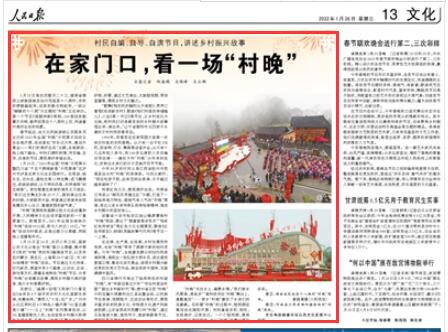 1月25日至26日,農(nóng)歷小年之際,國(guó)家公共文化云推出“村晚”接力云展播,集中展示《我的“村晚”我的年》融媒體節(jié)目,以及來(lái)自內(nèi)蒙古、黑龍江、上海等20個(gè)?。▍^(qū)、市)的30場(chǎng)精彩“村晚”活動(dòng)。節(jié)目通過(guò)文化傳承、時(shí)代新風(fēng)、展望未來(lái)3個(gè)篇章,以訪談、互動(dòng)、游戲等方式,展播各地特色“村晚”節(jié)目、分享“村晚”臺(tái)前幕后故事、展現(xiàn)鄉(xiāng)村振興美好畫卷、推介鄉(xiāng)村美景好物。