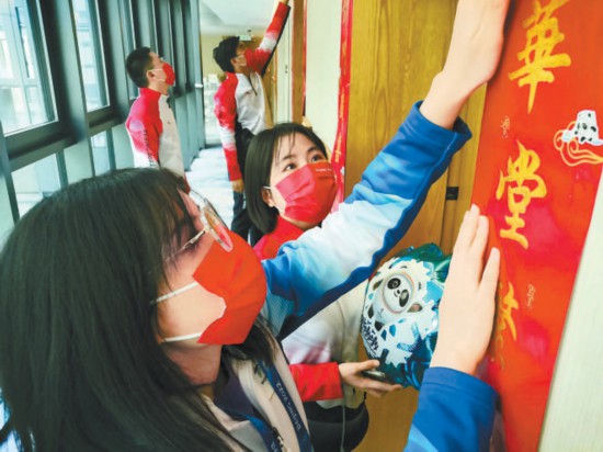 服務(wù)保障人員的村內(nèi)生活也趣味十足。下午3點(diǎn)多,一場“守海陀歲·延慶冬奧村新村民共贏未來”主題活動(dòng)在訪客中心舉行。“微笑的雪,為大地開花;愛灑向手心,純潔無瑕……”中外志愿者們用12種語言唱起北京冬奧會(huì)志愿者之歌《燃燒的雪花》,擊鼓傳花,匿名交換明信片,現(xiàn)場溫馨又熱鬧。而在媒體中心,志愿者寫福字,貼福字,迎接春節(jié)和冬奧的到來。晚上6點(diǎn)多,延慶冬奧村還迎來了“志愿者虎年春節(jié)聯(lián)歡晚會(huì)”,志愿者各顯身手帶來彈唱、傳統(tǒng)曲藝、芭蕾舞表演等節(jié)目,以“線上村晚”開啟新的一年。