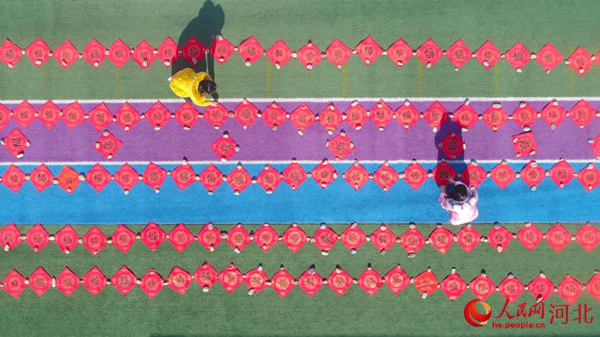 1月17日,河北省唐山市豐潤(rùn)區(qū)泉河頭鎮(zhèn)羅文口小學(xué)學(xué)生在晾曬為村民書寫的“?!弊?。 朱大勇攝
