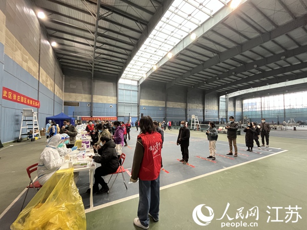 徐莊高新區(qū)體育中心網(wǎng)球館臨時(shí)集中檢測點(diǎn),志愿者有序引導(dǎo)市民保持一米距離。人民網(wǎng) 李子佩攝