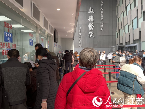 由于檢測人數(shù)較多,南京鼓樓醫(yī)院的核酸檢測隊(duì)伍存在一米間距不足的問題。人民網(wǎng) 馬曉波攝