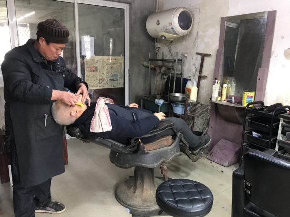 “推好了,來,再洗下,然后刮刮胡子。” 對話間,沈建平引導嚴老師到水池旁,用熱水沖洗了頭,然后請嚴老師躺到了另一張“古董”椅子上,繼續(xù)麻利地修面和刮胡子。