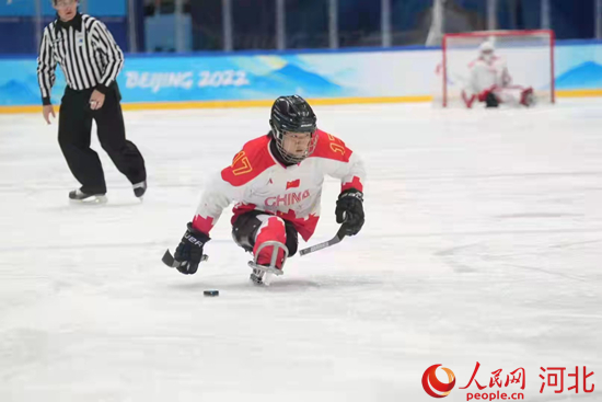 申翼風(fēng)在北京2022年冬殘奧會(huì)冰球項(xiàng)目比賽中拼盡全力。 申翼風(fēng)本人供圖