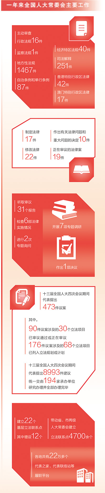 一年來,全國人大常委會制定法律17件,修改法律22件,作出有關(guān)法律問題和重大問題的決定10件,正在審議的法律案19件。