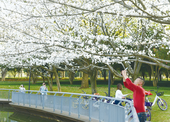 3月17日下午,在浙江義烏植物園,數(shù)百株櫻花在綠水環(huán)抱間悄然綻放。微風(fēng)拂來(lái),雪球般的櫻花輕輕搖曳枝頭,美不勝收。不少市民和游客前來(lái)賞花、拍照,享受春日美景。(錢(qián)旭升)