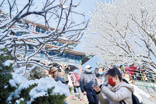 在其他市屬公園,昨天一早亦是同樣盛景——北海公園內(nèi),花雪簇簇映白塔;香山公園內(nèi),蠟梅傲雪更沁香;景山公園內(nèi),飛雪春花映紅墻……春花與雪相遇在園林古建中,共同構(gòu)建出詩情畫意的三月北京獨特春景。