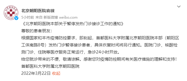 人民網(wǎng)北京3月22日電 據(jù)北京朝陽醫(yī)院官微消息,根據(jù)國家和北京市疫情防控要求,即刻起,首都醫(yī)科大學(xué)附屬北京朝陽醫(yī)院本部(朝陽區(qū)工體南路8號(hào))發(fā)熱門診暫停接診患者,具體恢復(fù)時(shí)間將另行通知。醫(yī)院門診、核酸檢測(cè)門診、住院等醫(yī)療服務(wù)正常運(yùn)行,急診24小時(shí)開放。