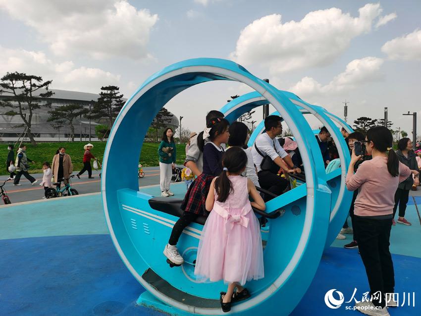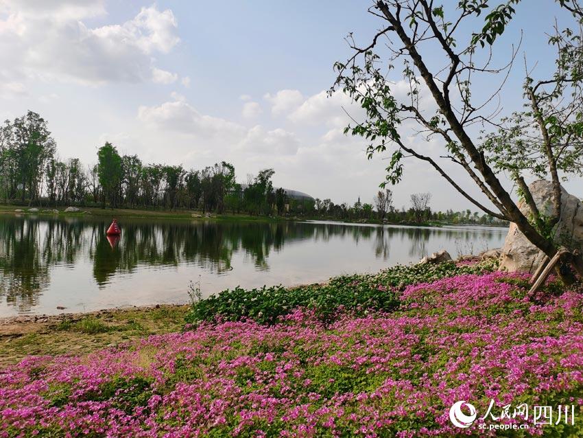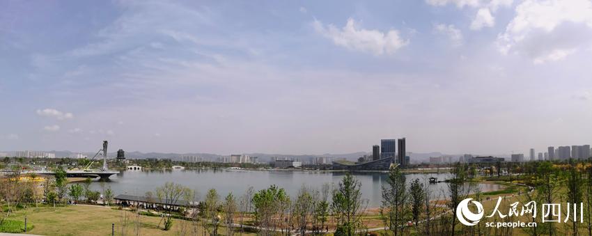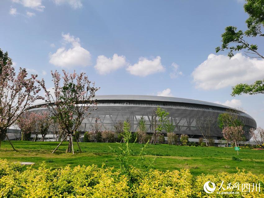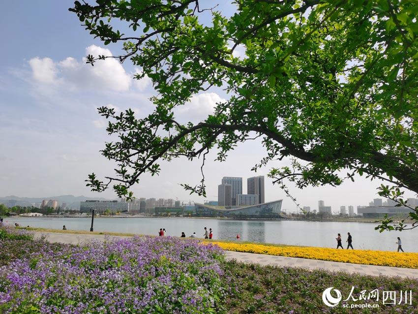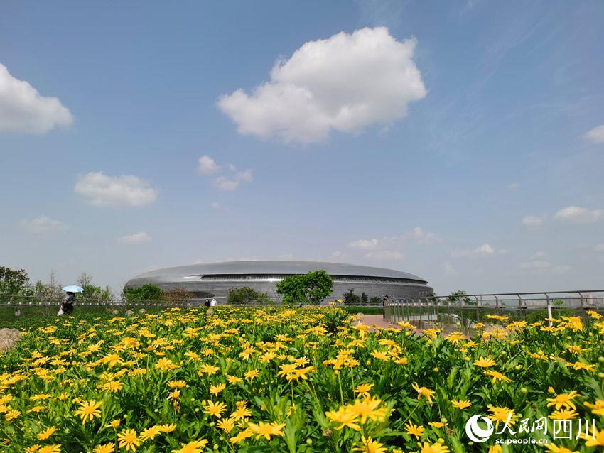 龍泉山脈綿亙遠(yuǎn)方,東安湖水蕩漾眼底,體育場館巍峨半空,花草樹木各展春姿。在湖光山色之間,有大量市民前來踏青賞春,順便欣賞著大運(yùn)會場館和火炬塔的風(fēng)采。