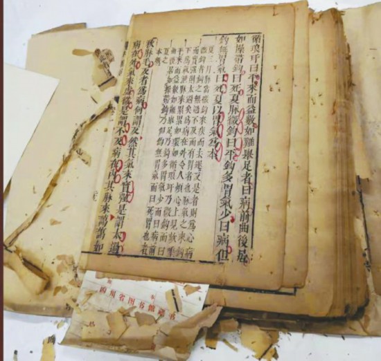明刻版《圖注八十一難經(jīng)辨真》是近年來四川省圖書館修復的重要古籍。它是明代張世賢注釋的一部醫(yī)經(jīng)著作,刊于1510年,共八卷。袁東玨回憶,這部書是在四川省古籍普查中發(fā)現(xiàn)的。當時用報紙包著送來,打開后,她倒吸了一口冷氣:紙張老化、脆化嚴重,不少書葉已碎成渣。最小的碎片僅一厘米長,還原非常困難。“比如,書中‘五行相生’中的‘相’字就斷裂開來,和其他文字碎片混在一起。我依據(jù)邊欄一塊一塊對照,才最終找到斷裂的碎片?!泵看涡迯?,她都屏住呼吸,生怕將碎片吹飛。不過,將一個個碎片拼接起來之后,她也很有成就感,“和年輕人玩拼圖一樣,折磨又有趣。”