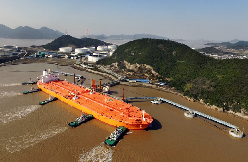 30萬噸巨型油輪靠泊岙山石油轉(zhuǎn)運基地。中國(浙江)自由貿(mào)易試驗區(qū)舟山管理委員會供圖