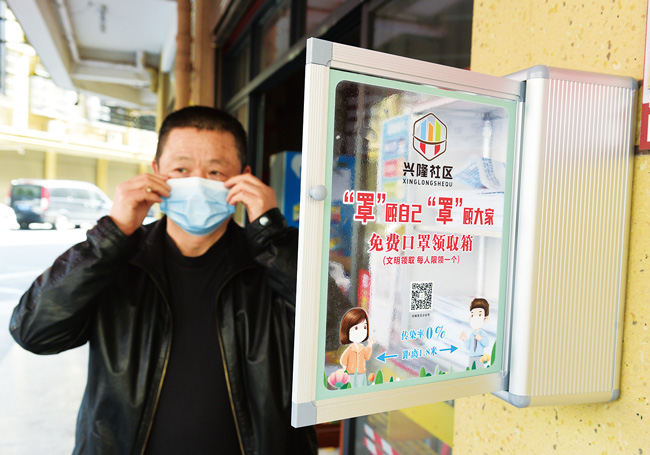 近日,浙江義烏福田街道興隆社區(qū)在轄區(qū)內(nèi)主干道出入口、人員密集的超市、藥店、快遞點(diǎn)等地設(shè)置免費(fèi)口罩領(lǐng)取箱,箱里放滿了口罩,箱體上寫著“文明領(lǐng)取,每人限領(lǐng)一個”?;顒娱_展半個月以來,6個免費(fèi)口罩領(lǐng)取箱共送出近6000個口罩。興隆社區(qū)黨委書記黃俊鋼表示,除了設(shè)立免費(fèi)口罩領(lǐng)取箱,社區(qū)還大力開展佩戴口罩勸導(dǎo)活動。(錢旭升)