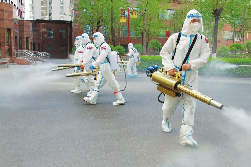 4月12日,在小店區(qū)千禧學(xué)府苑小區(qū),太原市應(yīng)急管理綜合行政執(zhí)法支隊(duì)的消殺隊(duì)員們正在消殺。隨后他們來(lái)到西吳村社區(qū)、丁香園、恒大綠洲、長(zhǎng)風(fēng)小區(qū)等居民住宅區(qū),對(duì)所有樓棟、垃圾點(diǎn)及室外公共區(qū)域等進(jìn)行全面消殺,牢牢筑起健康防線。(記者尤麗云攝)