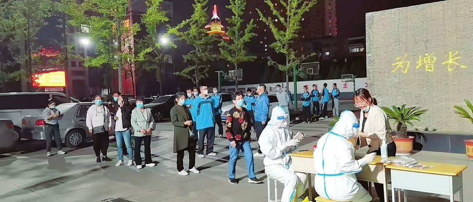 在太原市第三十中學(xué),醫(yī)務(wù)人員為該校師生做核酸檢測。