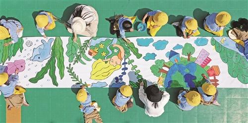 4月21日,臺州仙居縣幼兒園的孩子們在老師指導下創(chuàng)作珍愛地球主題繪畫作品。當日,幼兒園開展以“珍愛地球 人與自然和諧共生”為主題的教育活動,迎接“世界地球日”到來。通過繪長卷、環(huán)保時裝秀、垃圾分類等教育活動,引導孩子們愛護環(huán)境,共同守護地球母親。