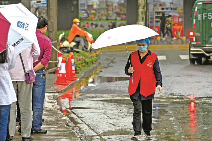 4月26日,在嘉興南湖區(qū)建設(shè)街道核酸采樣點,身穿紅馬甲的志愿者在風(fēng)雨中堅守崗位,為前來做核酸檢測的市民查驗“一碼一卡”。在疫情防控常態(tài)化下,志愿者持續(xù)奔赴在“疫”線,為筑牢疫情防控網(wǎng)發(fā)光發(fā)熱。(張啟帆)