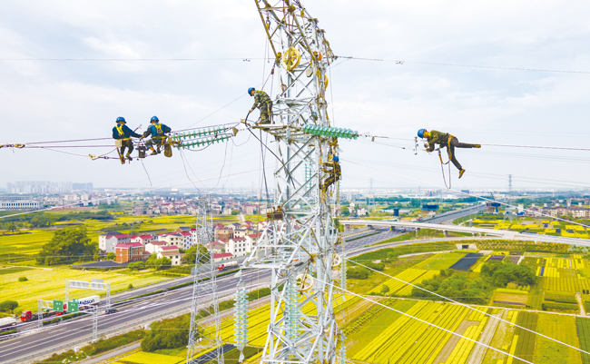 4月25日,金華市婺城區(qū)金蘭快速路竹馬鄉(xiāng)段道路旁,電力工人正在“仙橋一鹿田變”110kV線路鐵塔上開展高空架線作業(yè)。(胡肖飛)