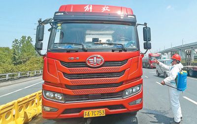 21日11時(shí)左右,記者在南京市雍莊交通樞紐見到郭輝時(shí),他已做完核酸檢測(cè)和抗原檢測(cè)。防疫人員正拎著酒精壺對(duì)貨車實(shí)施全面消毒作業(yè)。丁健將5份介紹信交給卡口工作人員,工作人員核對(duì)后退還了暫留的駕駛證、行駛證,將郭輝駕駛的貨車放行。