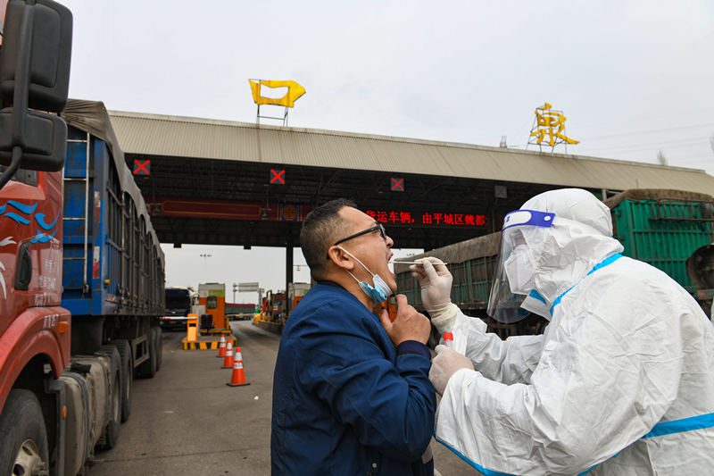 高速路口,保證物資流通的同時(shí),落實(shí)防疫要求,做到應(yīng)檢盡檢,不漏一人一車。張占兵 攝