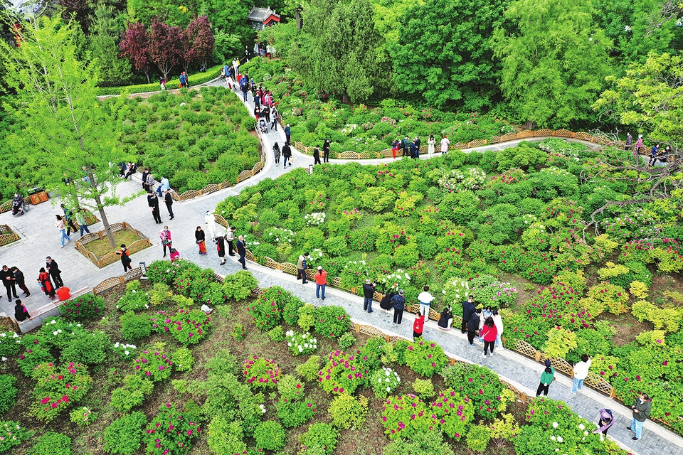 近日,太原迎澤公園牡丹園內,200多個品種、3000余株牡丹競相盛放,吸引了不少游客前來觀賞,呈現(xiàn)出人與自然和諧相融的綠色生態(tài)畫卷。圖為5月6日,從空中鳥瞰太原迎澤公園牡丹園。(記者李兆民攝)