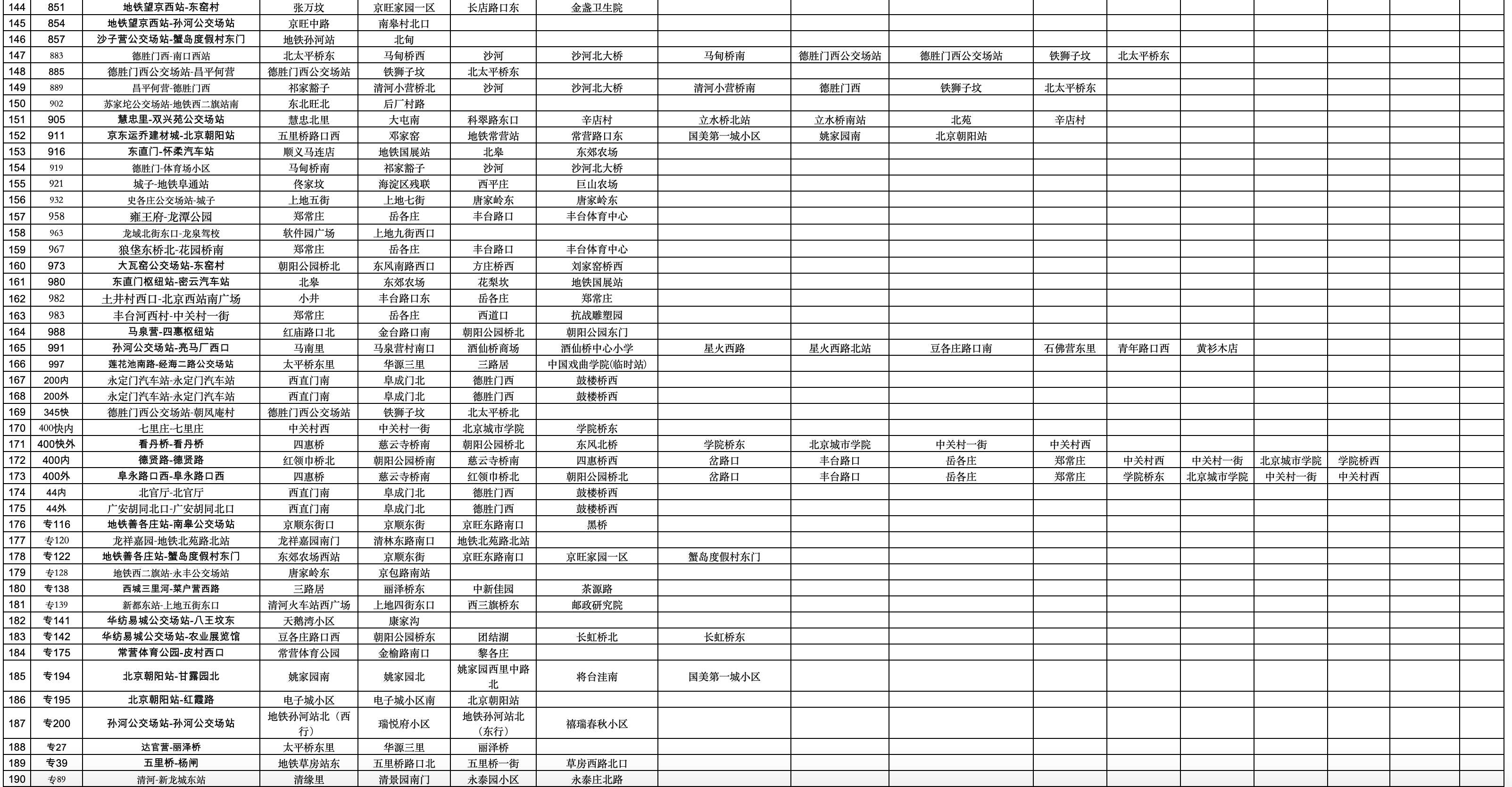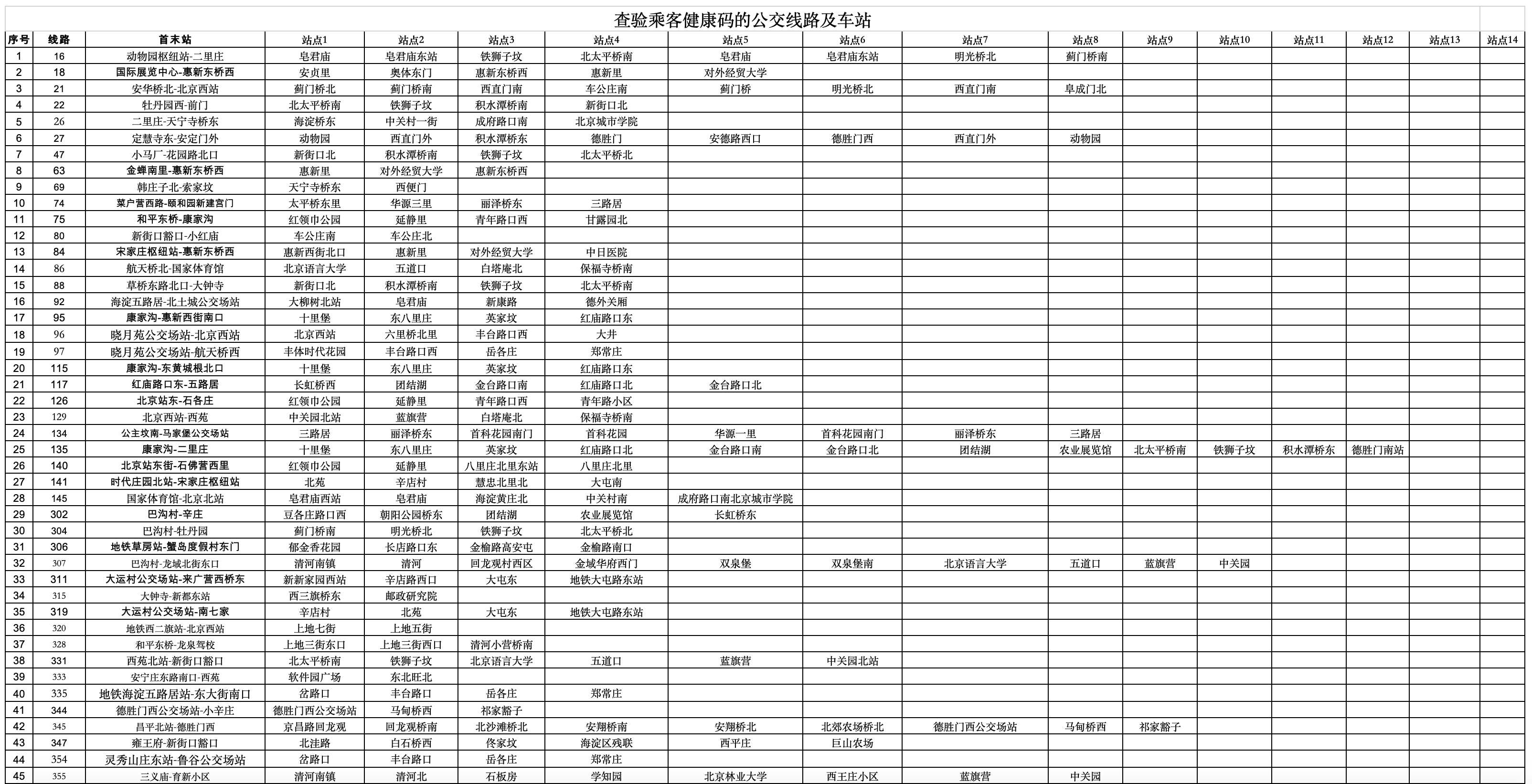 人民網(wǎng)北京5月16日電 (池夢蕊)根據(jù)北京市疫情防控需要,為做好精細(xì)精準(zhǔn)防控,自2022年5月17日首班車起,北京市疫情防控封控區(qū)、管控區(qū)周邊的190條地面公交線路重點車站和54座地鐵車站(具體見附表),查驗乘客健康碼上車。后續(xù)將結(jié)合北京市疫情防控措施進行動態(tài)更新。