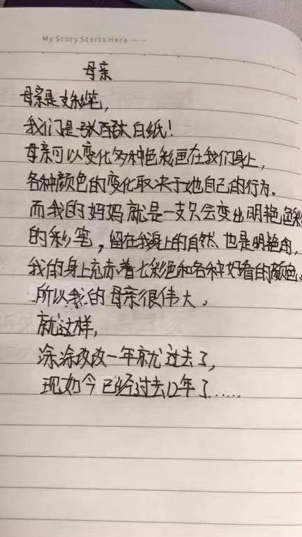 在與孩子們視頻通話時,盛楠收到了一封來自大女兒親筆寫的信:“母親是支彩筆,我們是張白紙。母親可以變化多種色彩畫在我們身上,各種顏色的變化取決于她自己的行為。而我的媽媽就是一支只會變出明艷色彩的彩筆,留在我身上的自然也是明艷的,我的身上充斥著七彩色和各種好看的顏色,所以我的母親很偉大。就這樣,涂涂改改一年就過去了,現(xiàn)如今已經過去12年了……”讀到這里盛楠濕潤了眼眶。