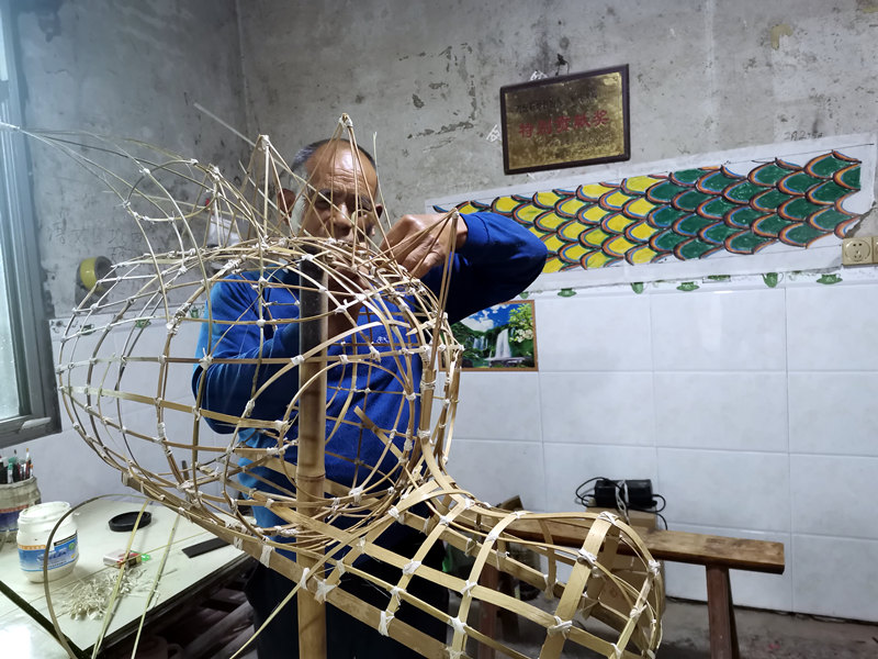 羅德編制雨壇彩龍骨架。曾佐然攝